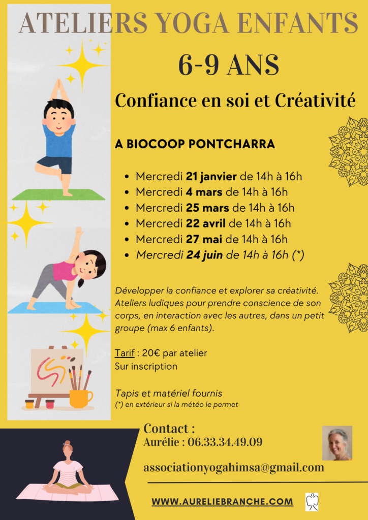 Merci au magasin Biocoop de Pontcharra de me prêter une salle pour des ateliers mensuels de yoga pour enfants. Petit groupe (entre 4 et 6 enfants), sur le thème de la Confiance en soi et la Créativité. Venez explorer la magie du yoga et laisser s’exprimer votre créativité !Au programme: la météo du jour, des exercices d’ancrage, des postures de yoga et de respiration, la réalisation de mandalas, le tout dans une ambiance ludique, bienveillante et respectueuse de soi et des autres.